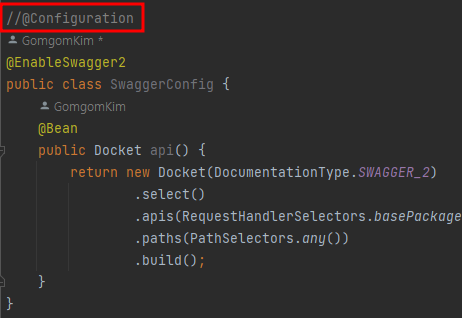 @EnableWebMvc(@EnableSwagger2)를 사용하는 파일에서 @Configuration를 삭제한다.